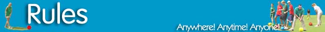 THE TEAMS: Blue/Green play against Red/Yellow in a two-sided game, with one or two players on each side. Each player may directly kick (or stroke) only his or her own ball in the order of play, but the player’s ball may impact other balls. In singles, one person plays both balls of the side in the proper sequence: Blue/Red/Green/Yellow. THE TURNS: Play is always in the sequence Blue/Red/Green/Yellow (the order of the colors on the stake and on the wickets). There is only one shot per turn. There are no bonus shots for scoring a wicket or striking another player’s ball with your own ball. STARTING THE GAME: The starting side is determined by a coin toss. The balls are played in proper sequence (Blue/Red/Green/Yellow) from the agreed-upon Starting Tee. This is the only tee-off in the entire game. All the other turns are played from where the balls lie. SCORING: Each wicket is scored by only one ball, which wins the point for its side. Wickets must be scored in the order and direction of the course. A ball must make a complete pass through the proper wicket from the correct side to score a point. Any number of turns may be taken to complete the pass through the proper wicket in the order of the course and thus score the point. After a wicket is scored by any ball, play continues in sequence from where the balls lie to contest the next wicket in the order of the course. THE HALF-WAY RULE: If at the beginning of a turn the player's ball is more than halfway to the next wicket in a position it achieved BEFORE the previous wicket was scored, the opponent may request that the player move the ball to any point within six feet of the last wicket to be scored, and the ball must be played from that position. WINNING THE GAME: House rules determine how many points must be earned to win the game; a four-point win is sufficient; if you want a longer game, you may repeat the course any number of times, playing continuously until the winning score is reached.